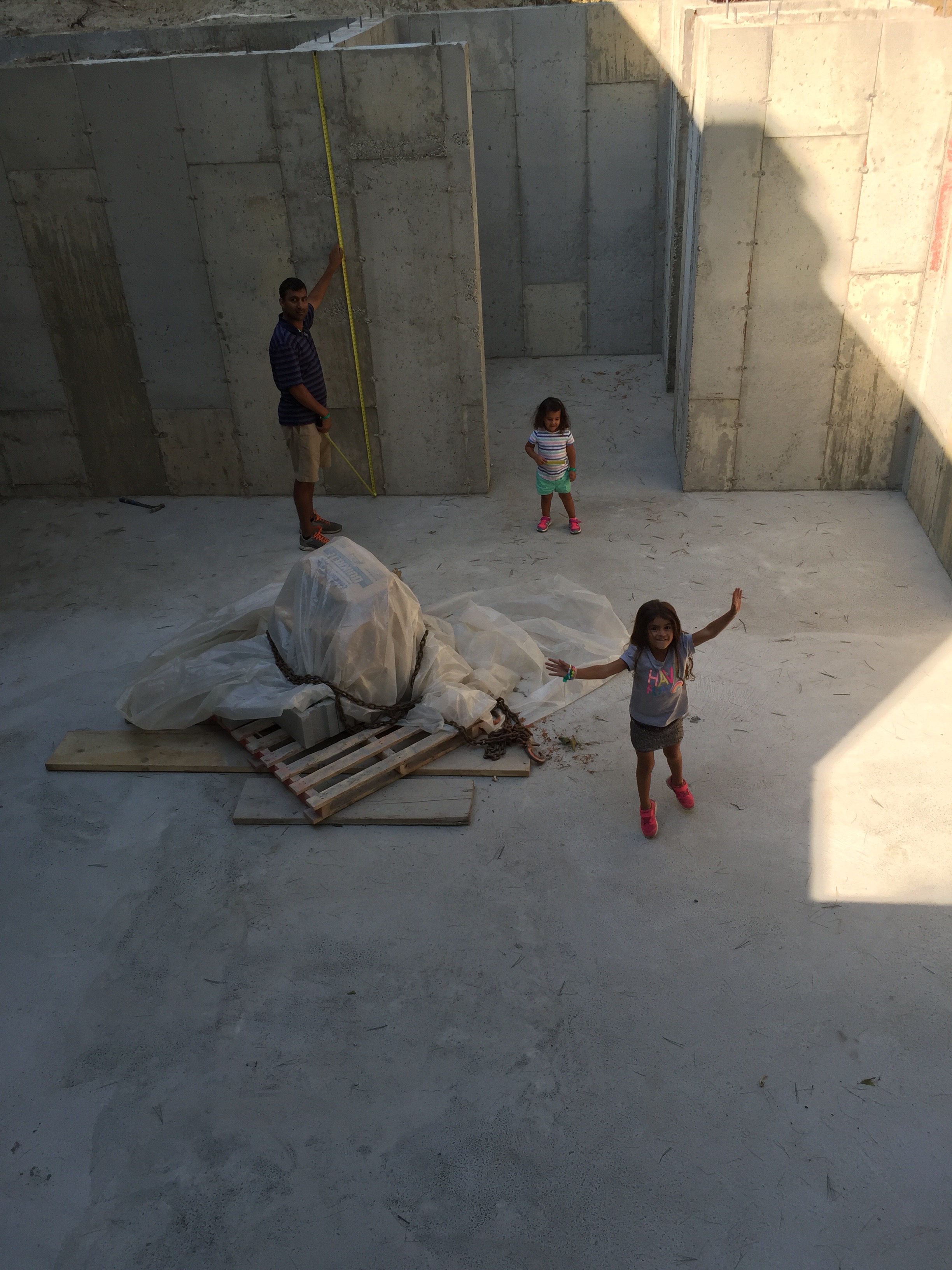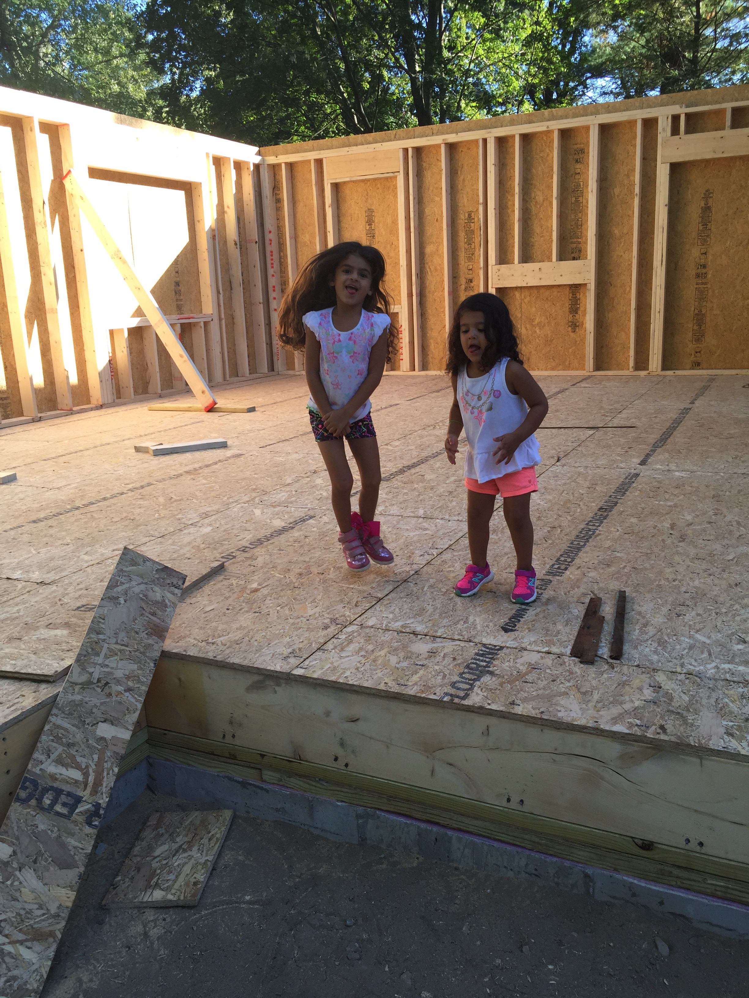 I’m trying to live in the moment these days which has been the theme in most of what I’ve written. I have to admit the moments have been pretty demanding with work being crazy busy, new everything going on, and all these major life changes. Nothing to complain about but definitely demanding. That said, my parenting skills are not exactly by the book these days. Today, I bribed both kids with the “treat” of being able to go in the backyard and check out the new construction site. They fell for it and faught (literally) to get their shoes on with tears and anger and honestly in the moment I should have told them we weren’t going as punishment it was that bad. Now truth be told, it’s the first time I’ve seen progress that I understand so selfishly I wanted to stand in the new spot that was built today and see it up close. So we ventured outside and jumped around in front of the “new fire place” and near the “new kitchen” (pictures below). This new area is exciting. I see and understand what we are building. Of course I looked at plans and have looked at them too many times to count but now I can actually visualize the size and scope of what we are doing. It’s awesome. Anyway, back to the terrors I had running around. I realized we were close to dinner time but not close enough and I had ZERO interest in staying outside in the blazing heat and less than zero interest in going back inside to listen to them bicker and fight and cry for another hour, I saw my parked car on the road and told them both they could sit in the front seat while I drove it into the driveway. Yep, that’s what I did. Drove for all of two seconds with them in the front seat and then we belted music and air conditioning for the next 20 minutes performed the best Rihanna, Drake, and Justin Bieber dance party you could ever imagine. Judge all you want but it worked and it made all of us really happy. Days like this I can do, days like Tuesday when Maia ventures to her first day at preschool I can’t. I will but I really don’t want to. As much as they drive me crazy and exhaust me, they do the best possible things in the best possible moments too like draw pictures and say “mommy I love you” out of the blue. Those moments are everything and today’s dance party was too.