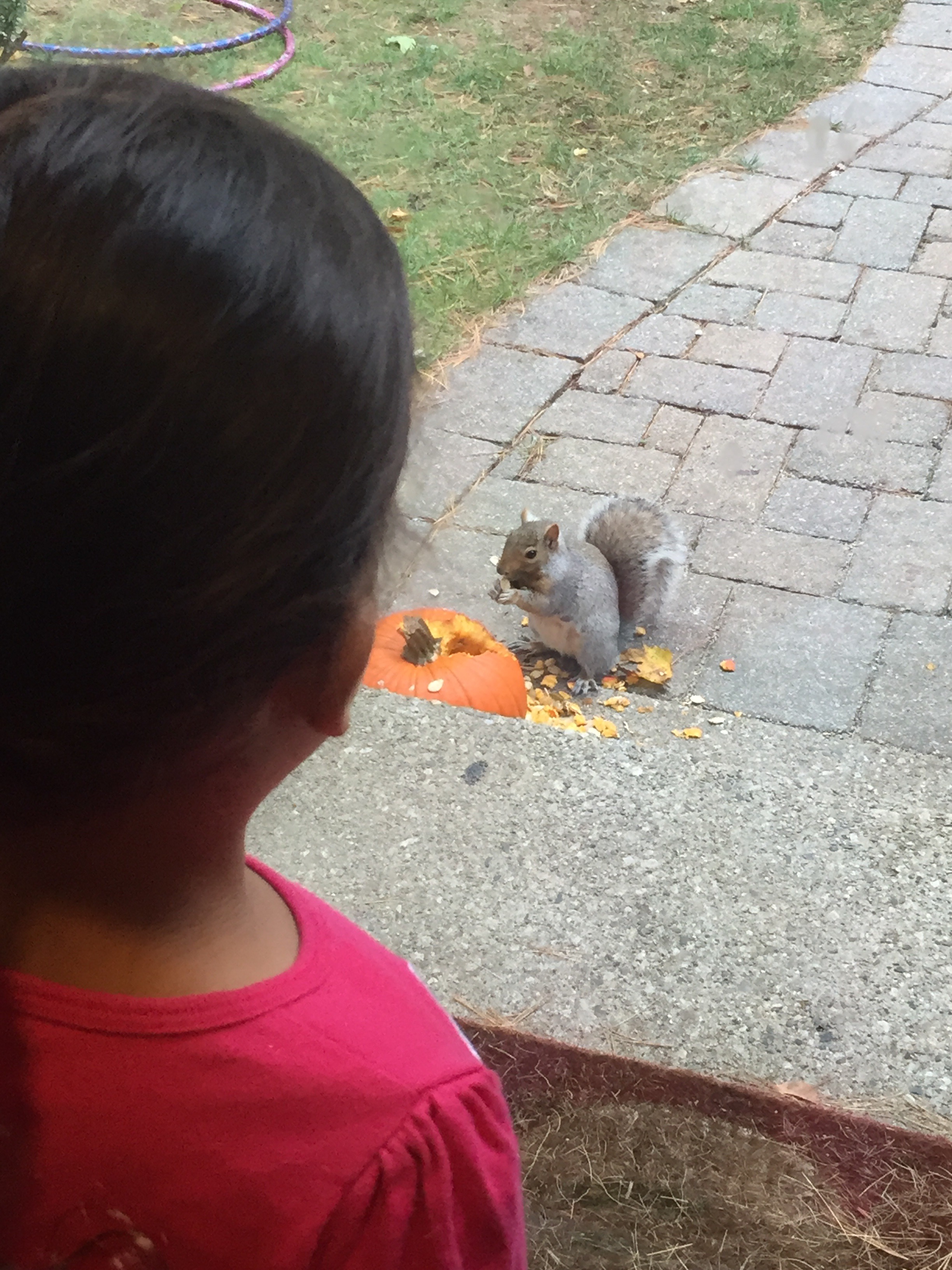 This is “esquilo” which literally means squirrel in Portuguese. Esquilo is completely trying to mess with my daily routine and set my kids into meltdown mode on the daily. Last weekend we opened the door to drive to school and Emma yelled “oh no esquilo ate Maia’s pumpkin” which to a three year old Maia might as well have meant that her world was ending. All of our nice lined up painted pumpkins were fine with the exception ofMaia’s. Hers had a hole in it. She began crying real tears. Hardly understanding why he picked her pumpkin. I quickly defused the situation with bribing Maia with a new pumpkin and we moved on with our morning routine off to school. We’ve since purchased two additional pumpkins to prevent esquilo from eating everything. Dude has to get full at some point right? Wrong. Last night we opened the door to wait for dad to come home and who was an arm’s length away going to town on the pumpkin but esquilo. He was completely unphased with not one, not two, but FOUR people staring at him. So I videoed as this 4 inch creature stared all of us down while crushing our pumpkins. The girls were at first horrified. Maia kept saying “mommy I used to like esquilo now I think he’s mean” which I had to explain that not all squirrels are mean (even though I might be lying) and that this squirrel is behaving badly and he might need a time out. As I was explaining this to her this brazen 4 legged creature jumped up onto the step closer to us looked us in the eye and made me feel like he was larger than a grizzly bear. Now I have to admit we were all behind a shut